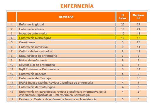 "Enfermería Nefrológica" cuarta en ranking de Google Scholar Metrics en Revistas de Enfermería, sólo superada por revistas generalistas de Enfermería.